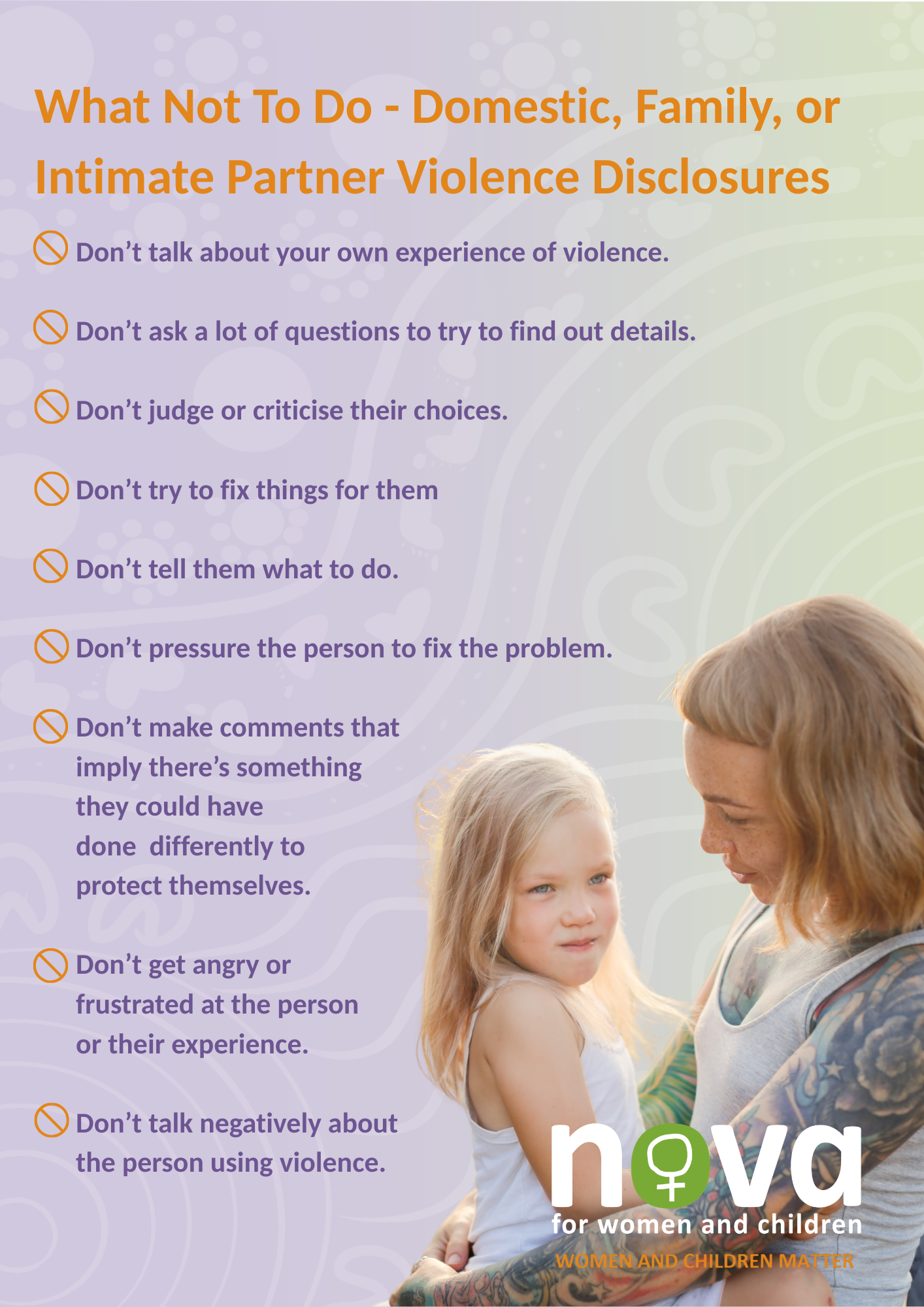 Nova for Women and Children has created this easy-to-follow resource to help supporters, their friends, colleagues, and loved ones who share with them that they are experiencing domestic, family, or intimate partner violence.